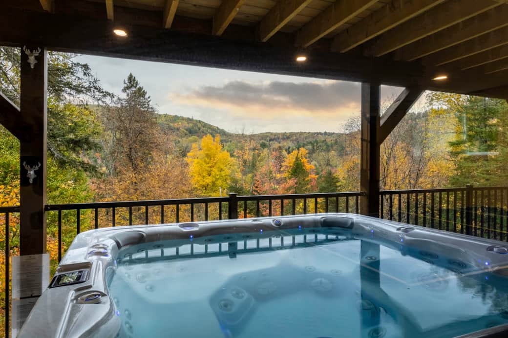 Spa privé extérieur offrant une vue à couper le souffle, idéal pour se détendre en toute saison.